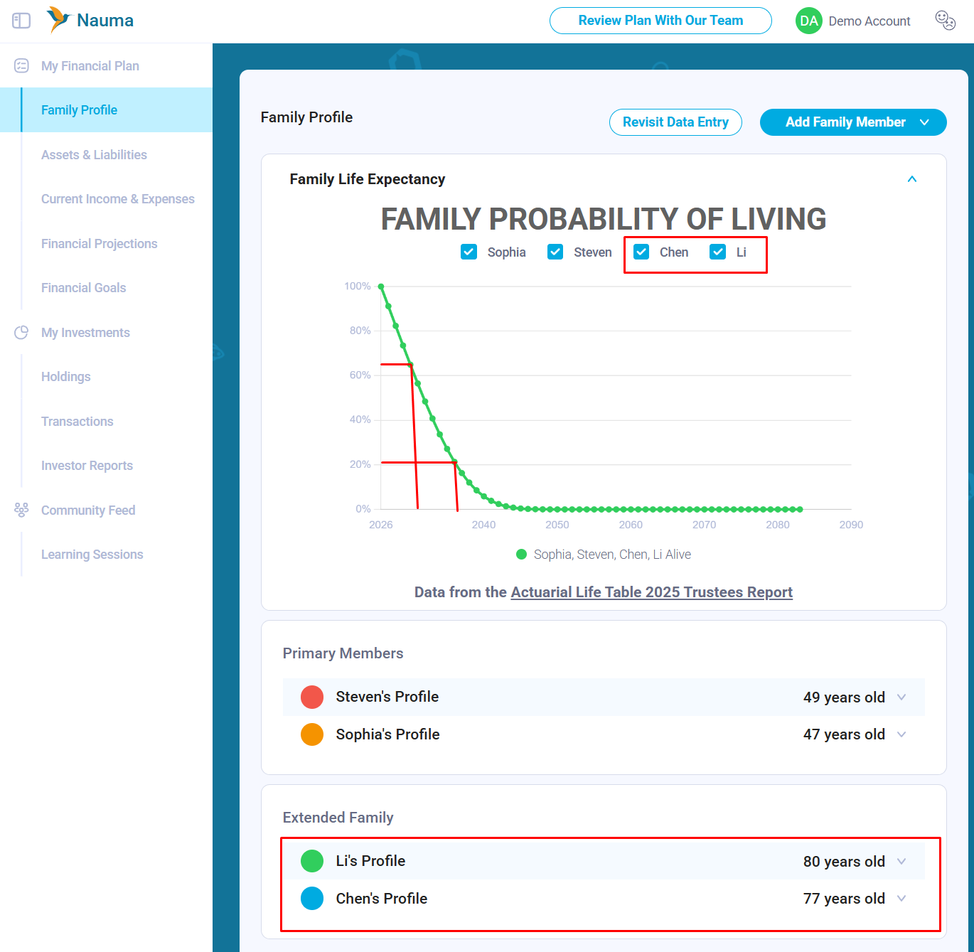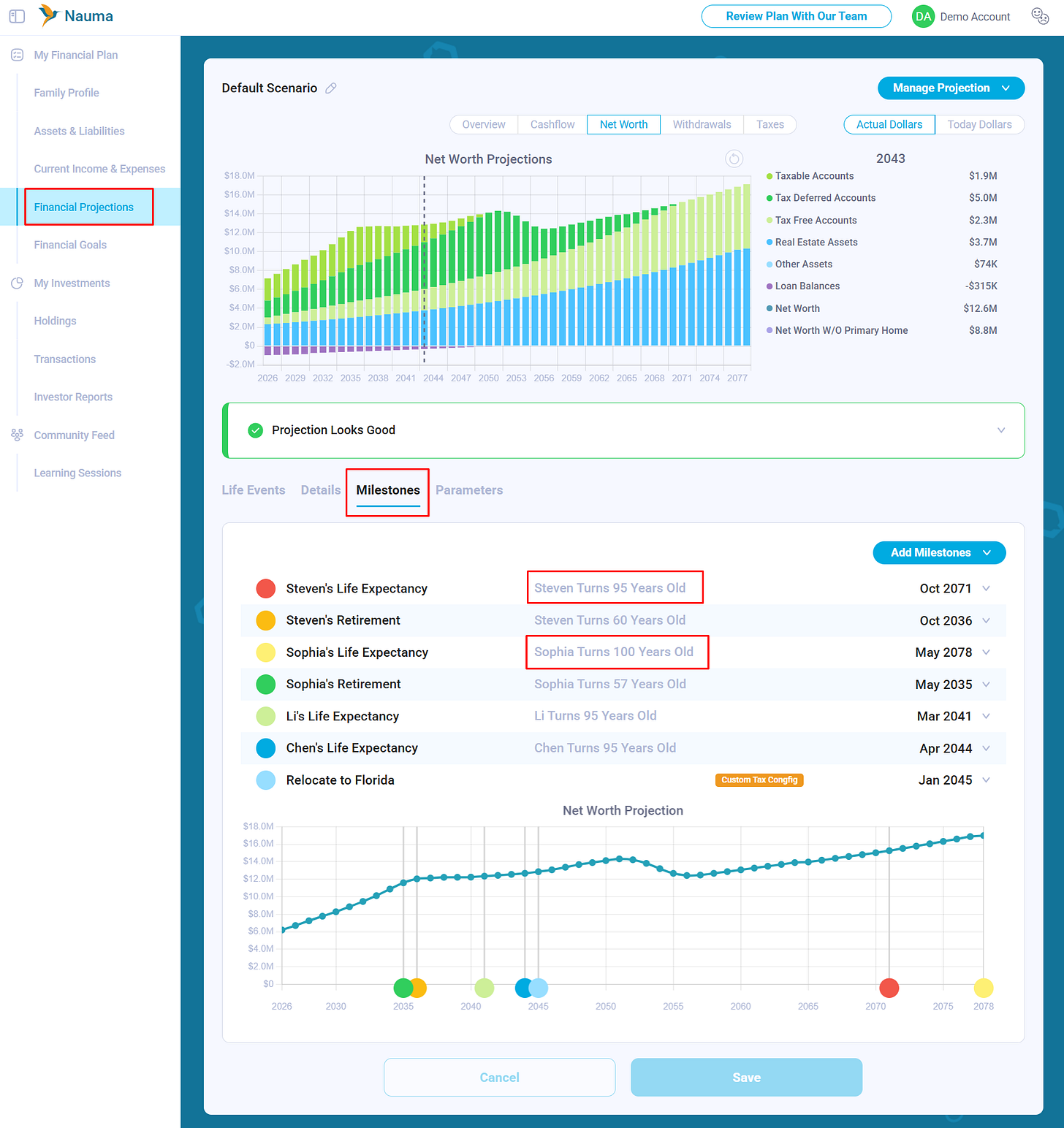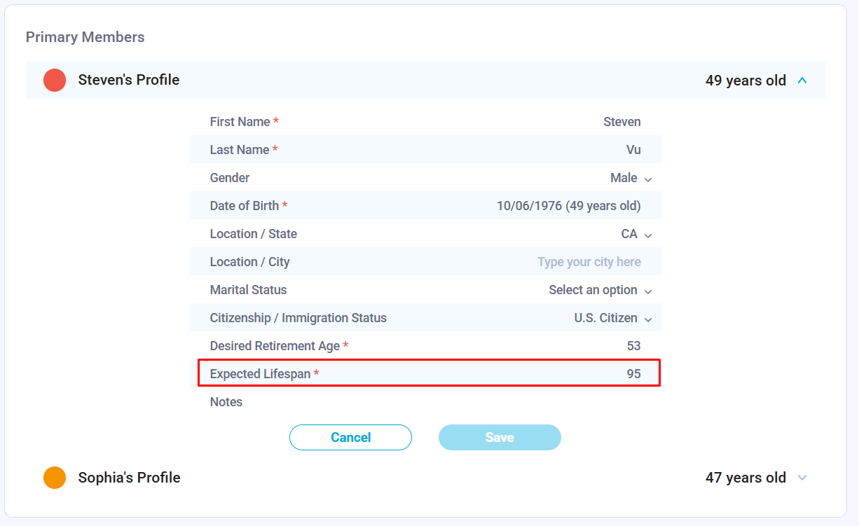 If you are just starting to use Nauma, you can set the Expected Lifespan for each family member in their Family Profile. Newly created financial projections will use these values to create corresponding milestones and set the correct duration for your plan.