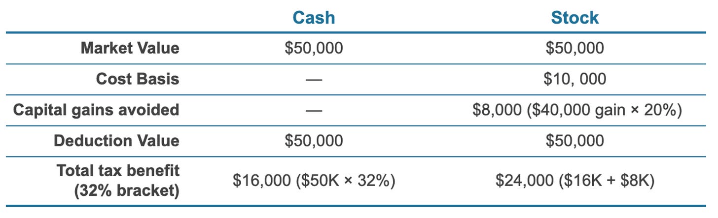 Let’s look at a simple example comparing a $50,000 cash donation to a $50,000 stock donation.