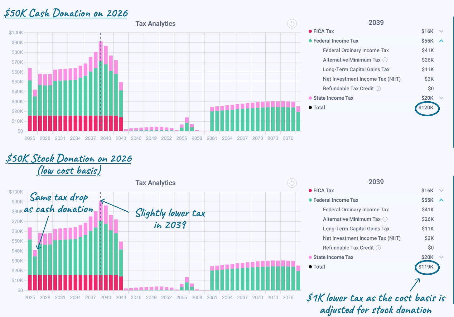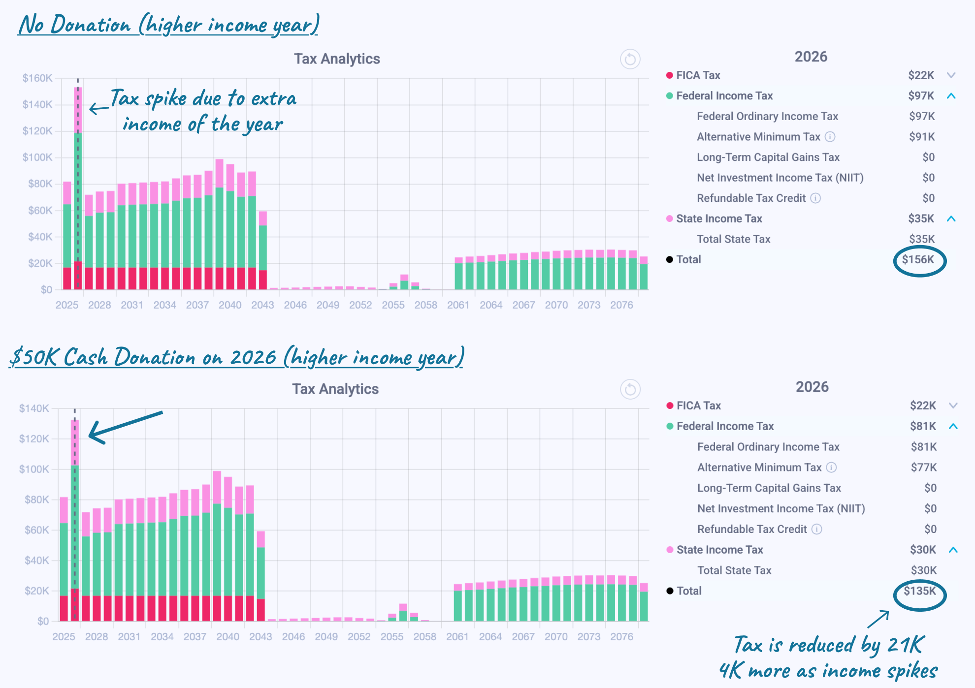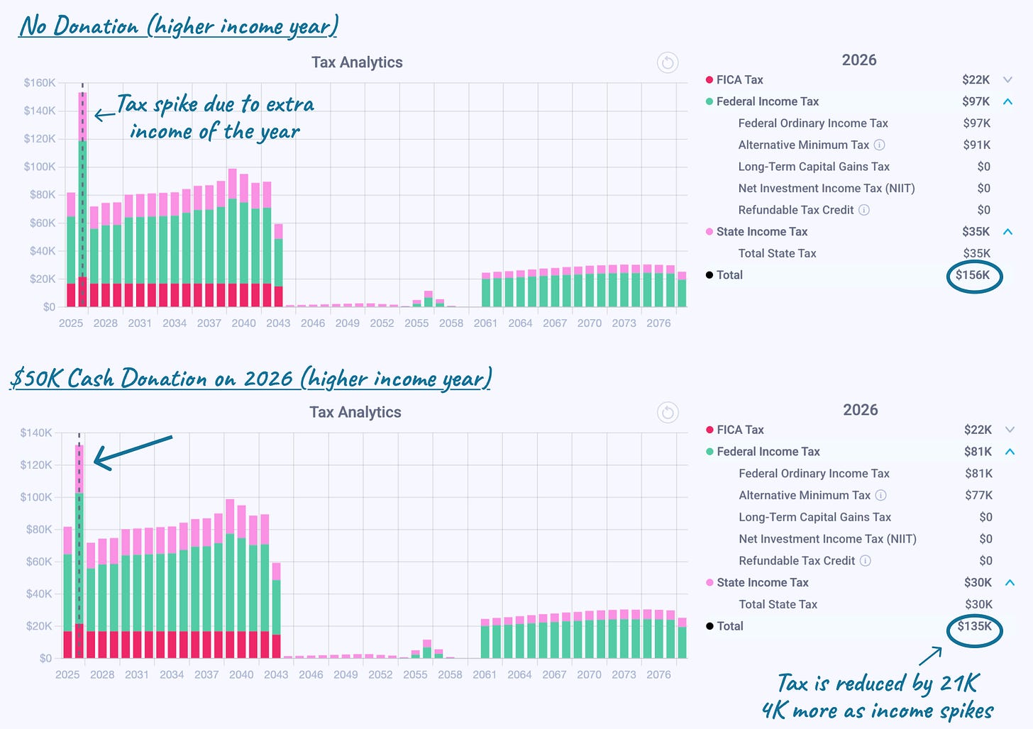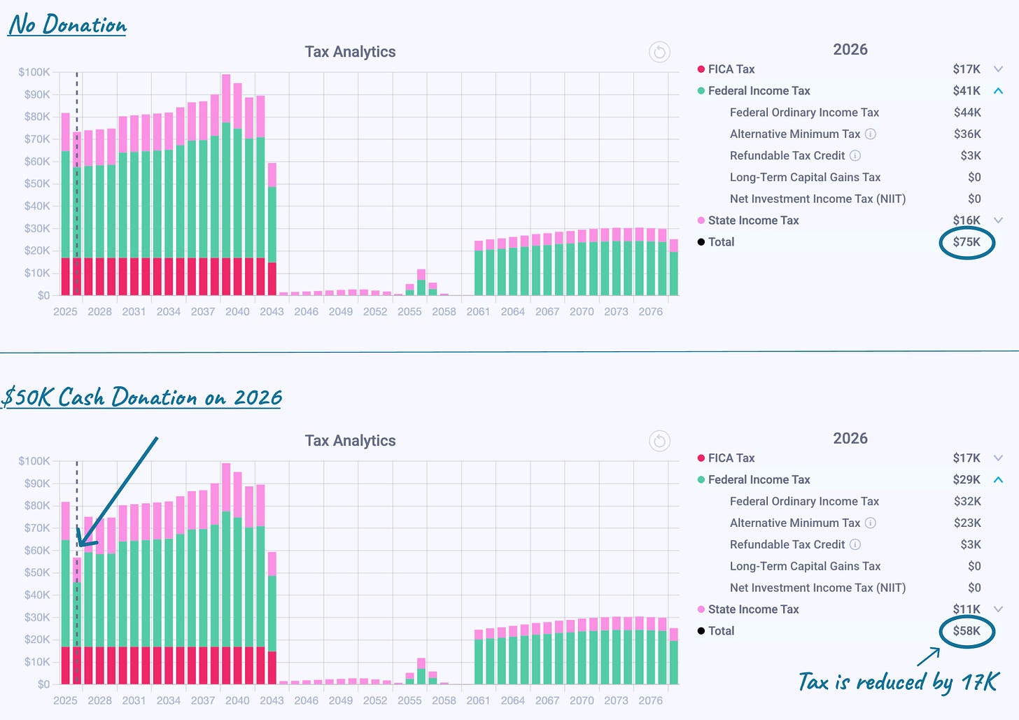 In the projection, the donation barely affects their overall cash flow — it shows up as a small, one-year expense — but the tax benefit is immediate and significant. The deduction lowers their taxable income and reduces their federal tax bill for that year.