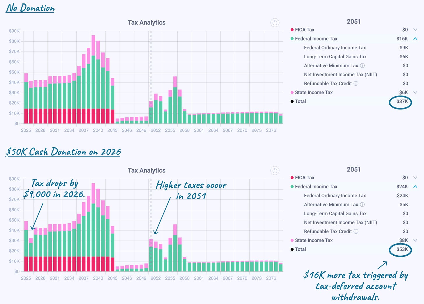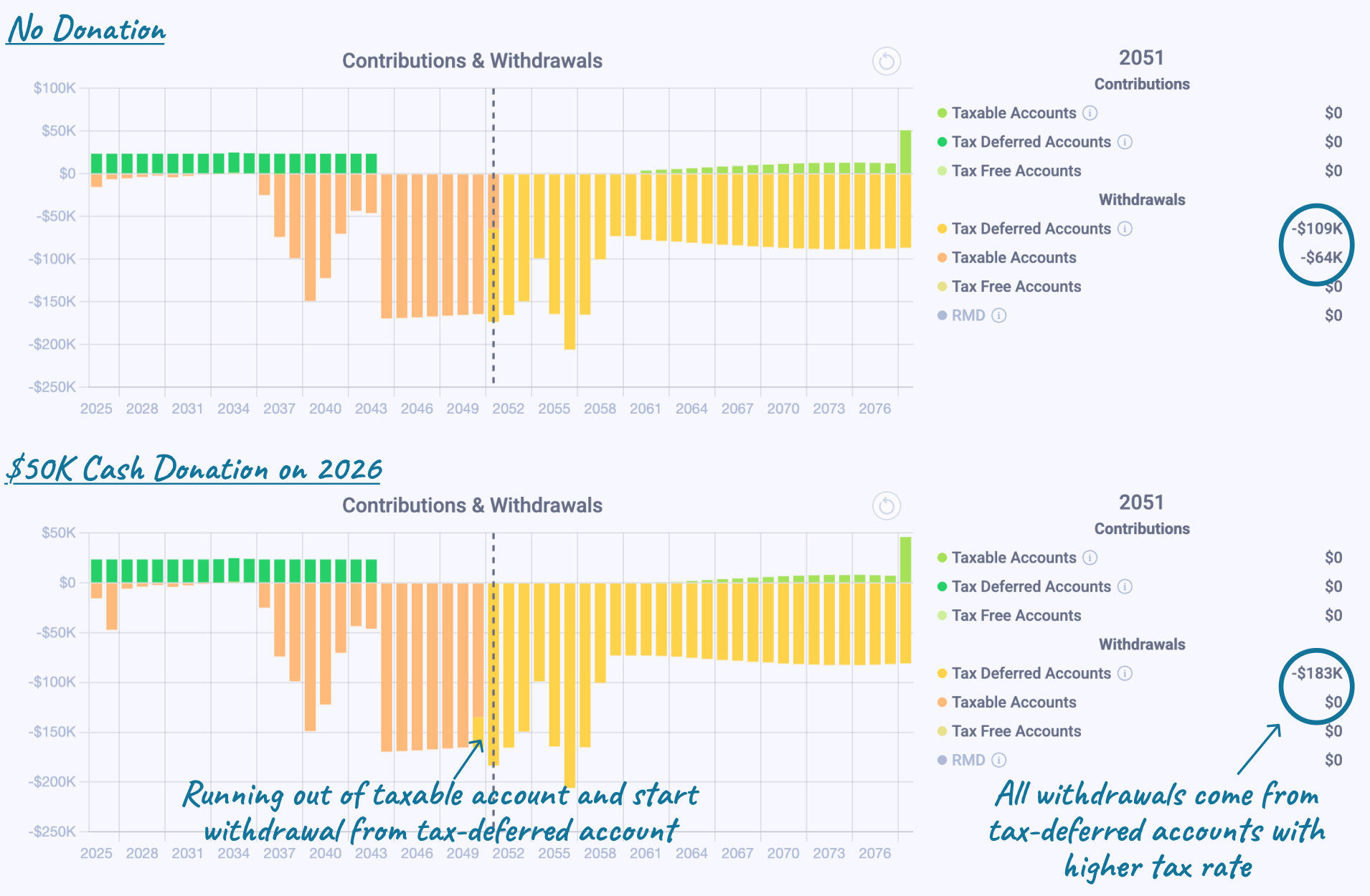 Over time, however, the donation reduces their liquid savings, leaving less flexibility later in life. In our projection, their taxable account is depleted around 2051, forcing them to draw from tax-deferred accounts earlier than planned. Those withdrawals are taxed as ordinary income, increasing their tax liability in later years.