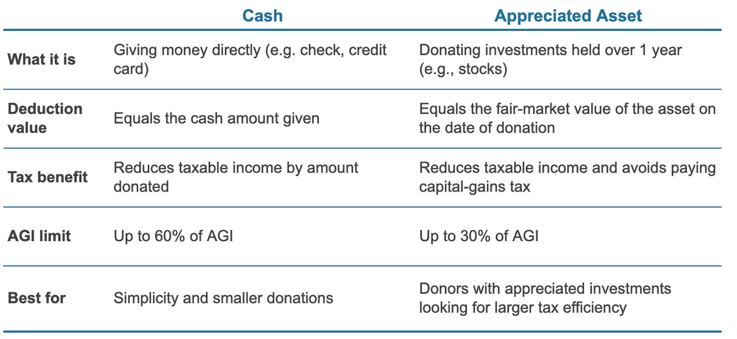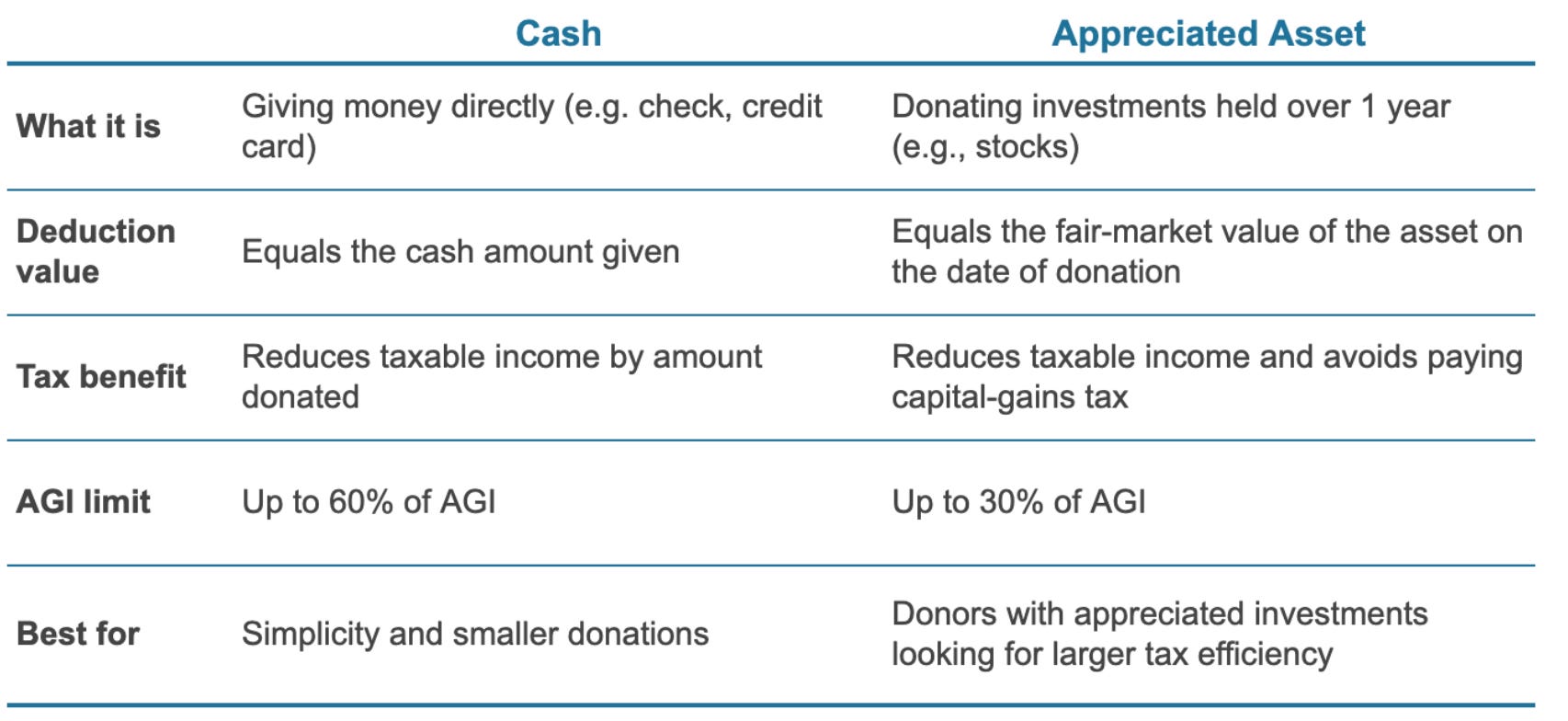 When it comes to charitable giving, the two most common methods are cash donations and donations of appreciated assets such as stocks, ETFs, or mutual funds.