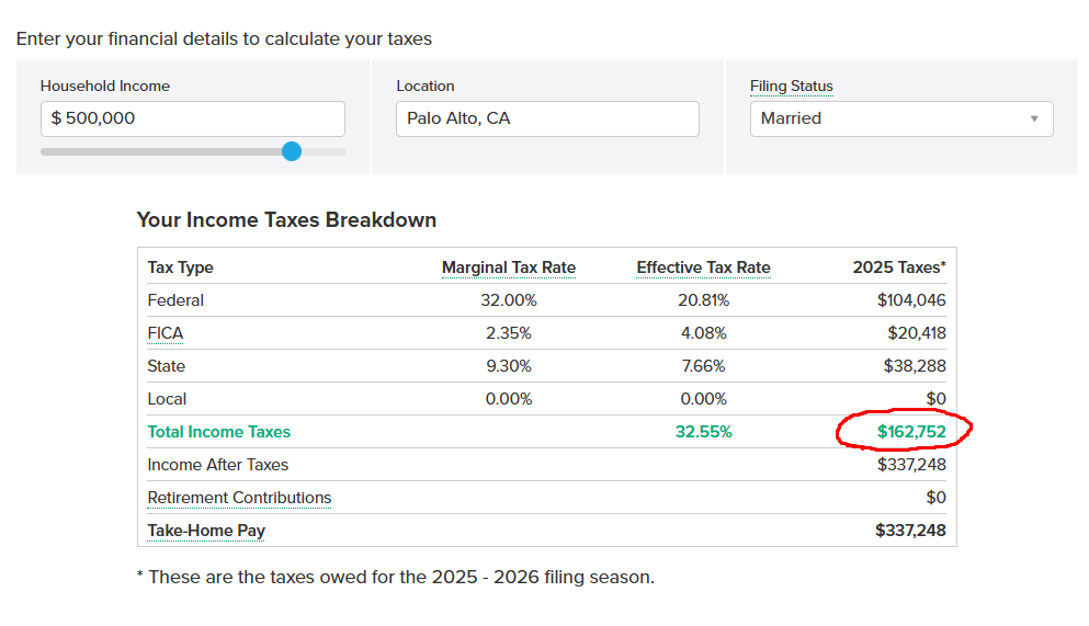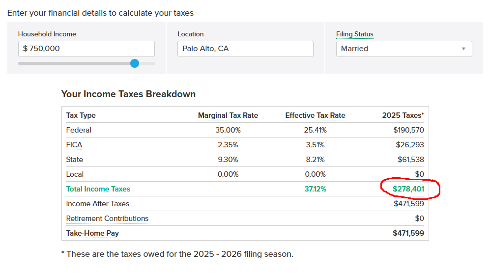 At a $750K income level, your effective tax rate is about 37.13% and total income tax is $278K. By reducing your AGI by $225K, you reduce your total income tax from $278K to $162K which results in a $116K saving in year one. You’ll continue reducing your taxable income until you fully use your charitable income tax deduction which depends on CRUT parameters.