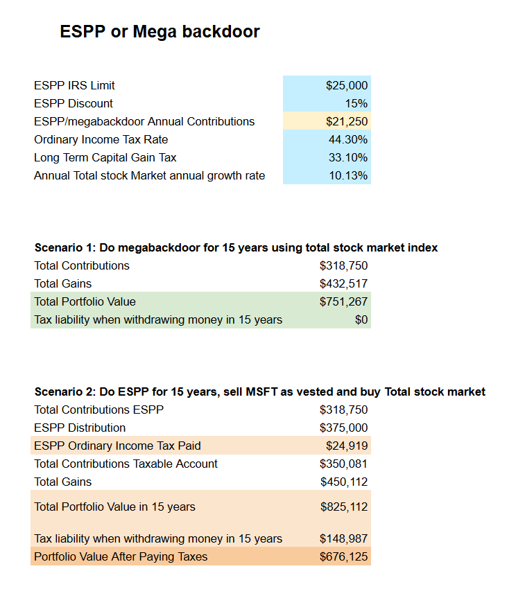 To make two scenarios comparable, we assume that the family can allocate only $21,250/year from their paycheck and must choose between ESPP and the mega backdoor. Here’s how the numbers work out over 15 years: