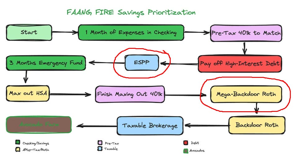 Pick one strategy that benefits your family the most. For some families it would be ESPP, for others it might be a mega backdoor. Understanding long-term trade-offs can help you make a better decision and avoid local optimums when building your wealth. This is the simplest approach.