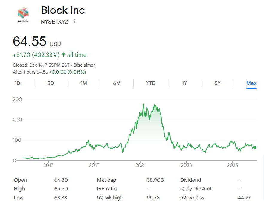 Consider the case of Block, Inc., a fintech company best known for Square, Cash App, and its crypto-related products. The company went public in 2015 under the name Square and later rebranded to Block. During the 2021 tech bull market, the stock reached an all-time high, fueled by growth expectations and enthusiasm around fintech and Bitcoin. In the years that followed, the stock experienced a significant drawdown, lost around 75% of its value and never recovered since then.