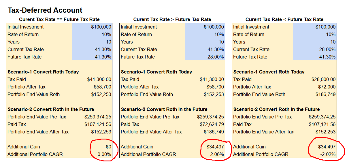 This means that there is no difference between doing a Roth conversion (and paying taxes) today or in the future, as long as the current and future tax rates remain the same.