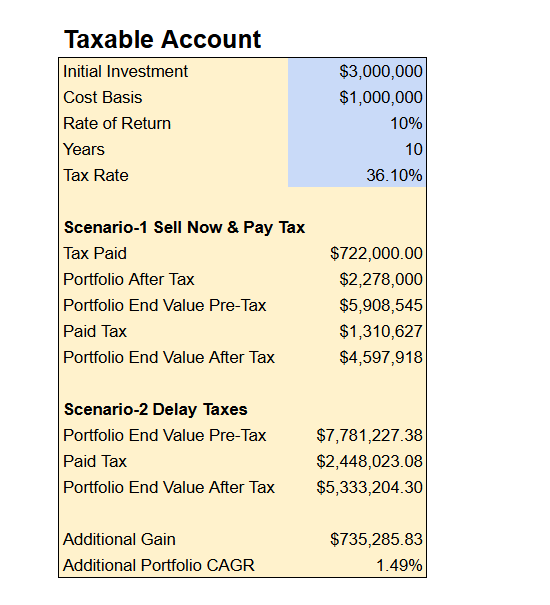 By delaying taxes in a taxable account, the investor increases their expected after-tax portfolio value. In this example, over a 10-year period with a 10% annual return and a 36.1% LTCG tax rate, the investor generates an additional $735K in after-tax value, equivalent to increasing their post-tax growth rate by ~1.5% per year.