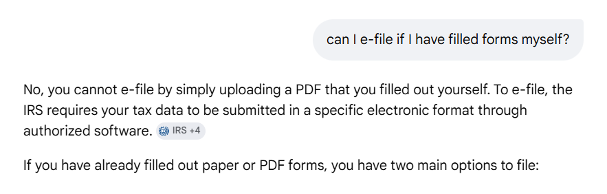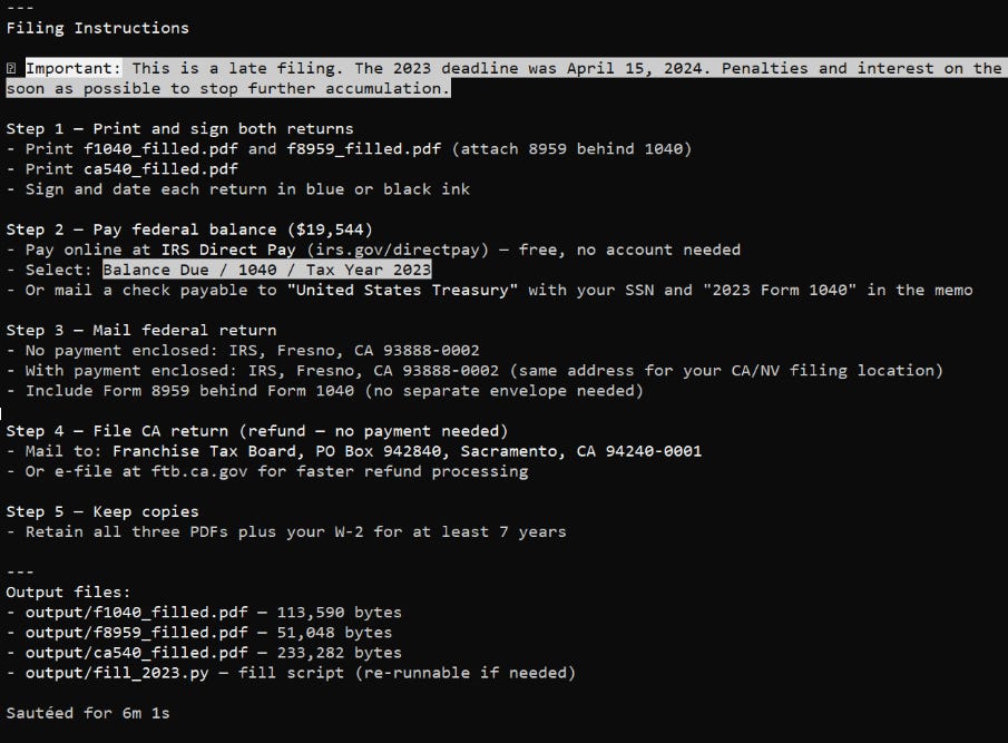 As long as a human is responsible for verifying the data and fixing bugs, this is a manageable issue. However, the bigger hurdle is the final step. Claude suggests printing the forms, signing them by hand, and mailing them to the IRS. Anyone who has dealt with the IRS knows that preparing a physical package, driving to the post office, and paying for certified mail is a time-consuming chore.