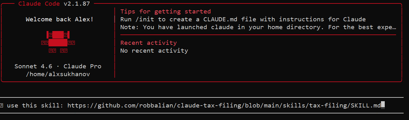 To begin, you simply run Claude and instruct it to use the skill. It then guides you through a series of predefined questions, including where to find your W-2, 1099, and other forms on your local machine.