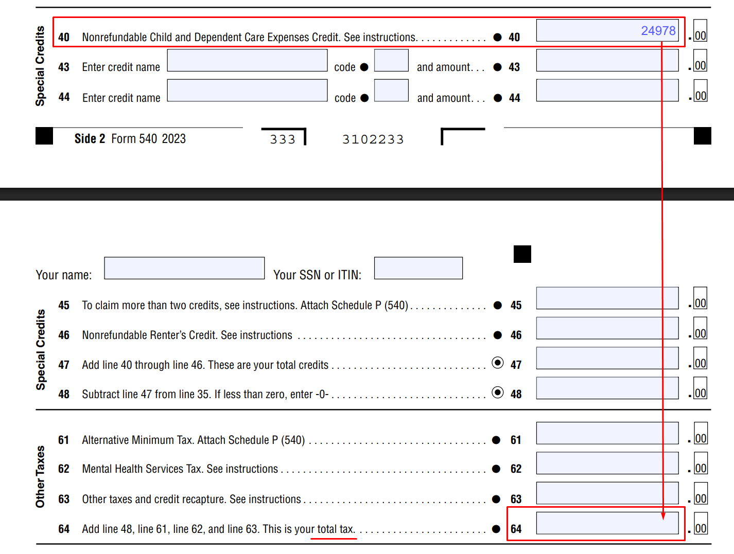 While the Federal return looked accurate for my simple case, the California State Return (Form 540) contained a notable error. Claude mistakenly entered the total tax which belongs on Line 64 into Line 40 (Nonrefundable Child and Dependent Care Expenses).