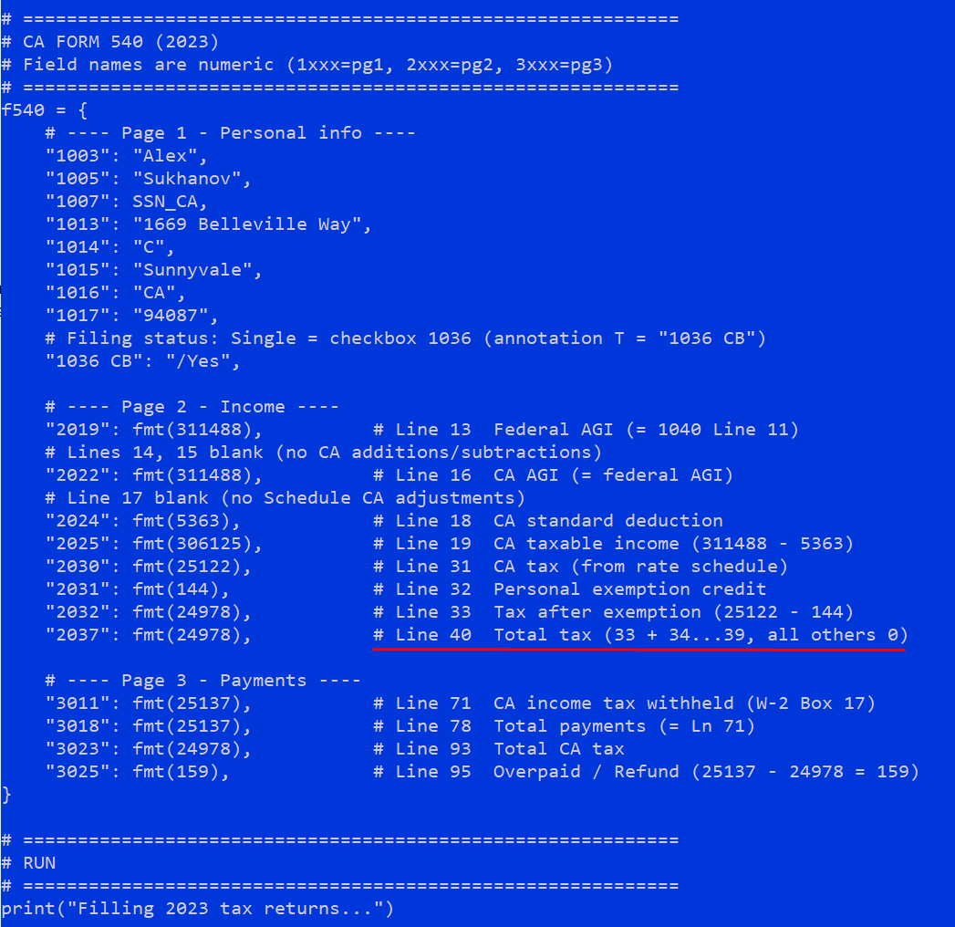 I currently use a $20/month Claude subscription, which is usually sufficient for my tactical needs like brainstorming technical designs or refactoring code. However, generating this “simple” return (consisting only of Form 1040 and Form 540) consumed 95% of my daily quota. This suggests that for a tax return with any real-world data, a $200/month subscription would likely be necessary.